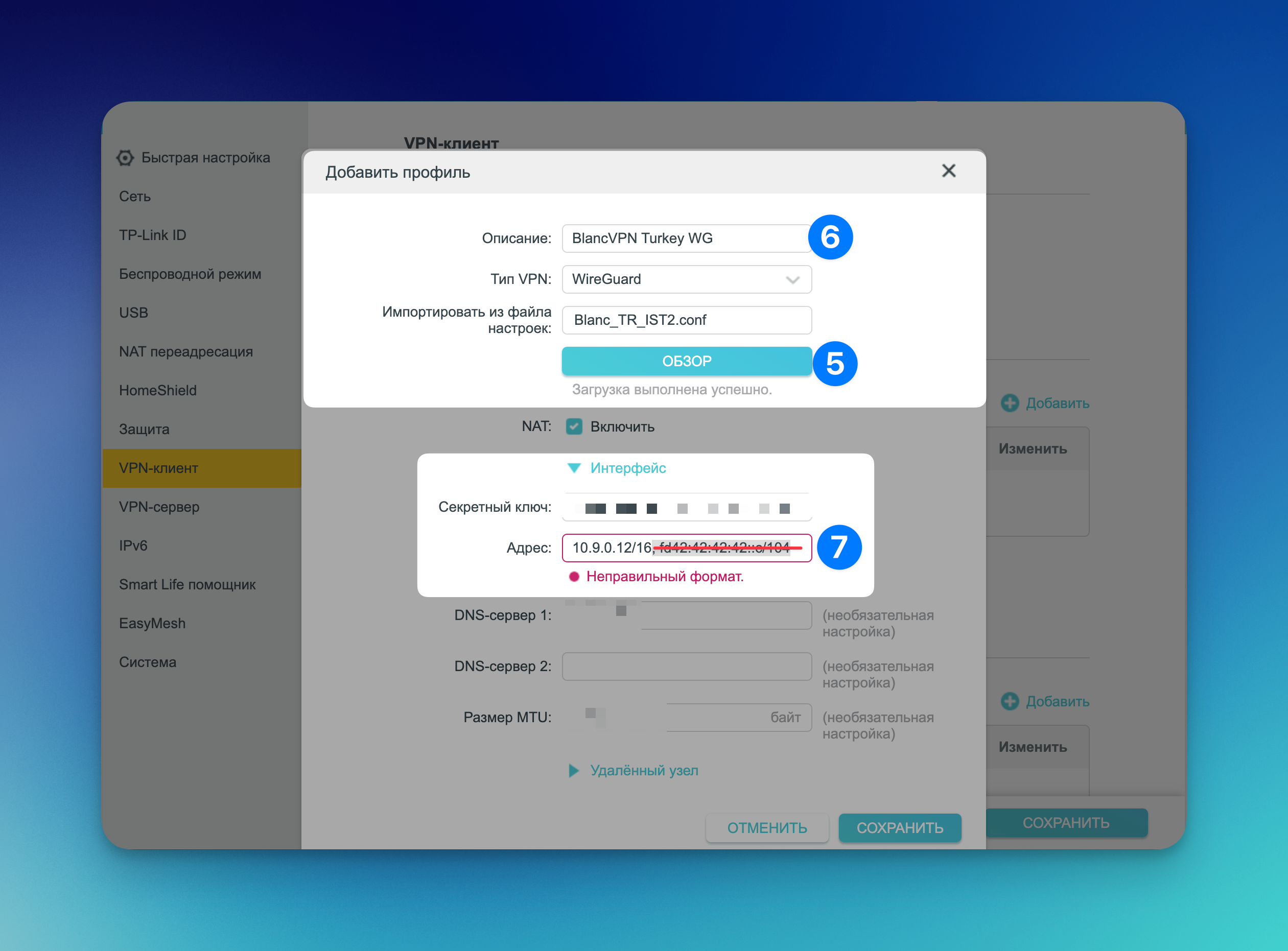 Войдите в личный кабинет. Нажмите Установить → выберите устройство → Другой VPN-клиент → перейдите к инструкции → TP-Link → в графе Локация и протокол выберите WireGuard и локацию → сохраните нужное количество файлов конфигурации .conf.