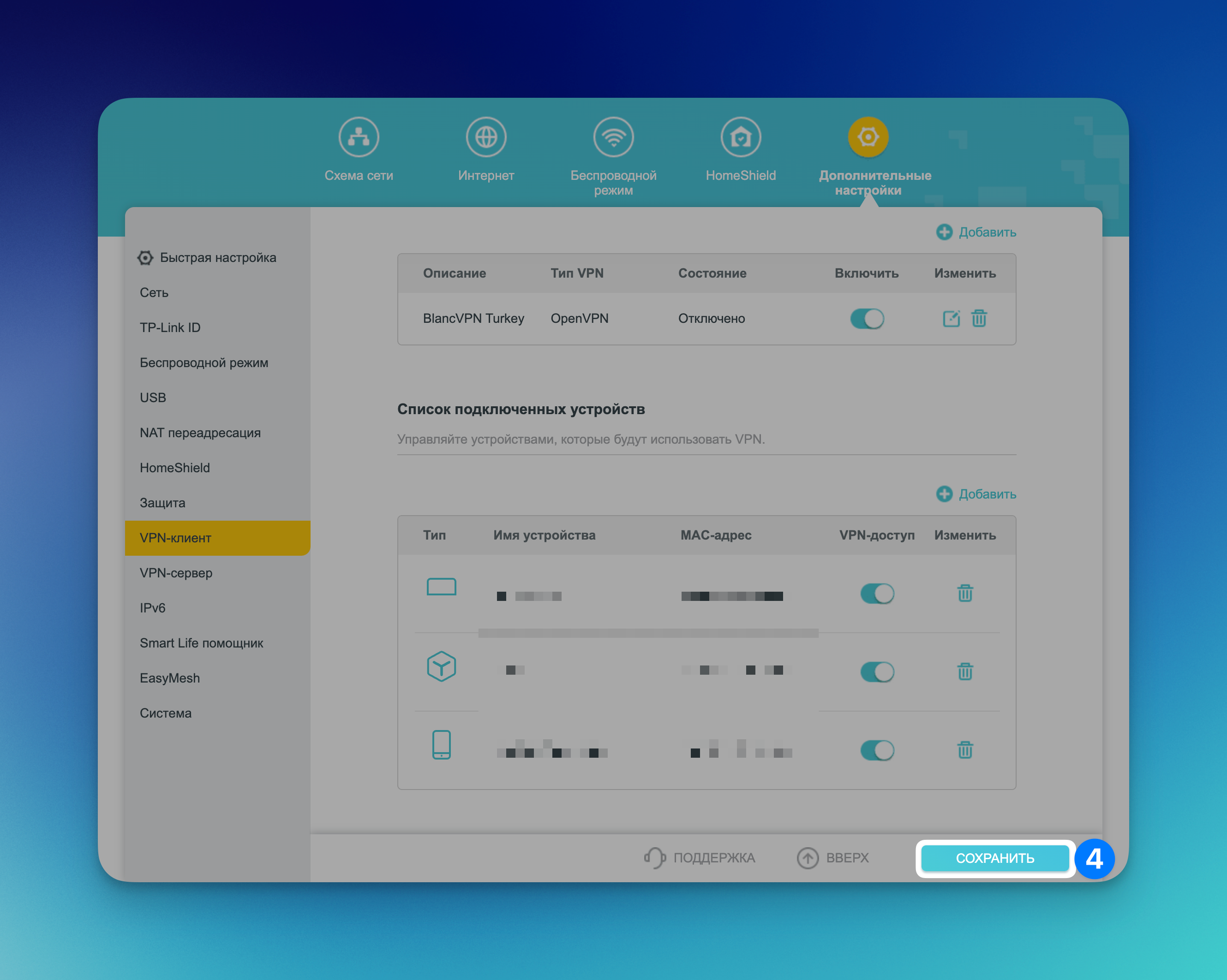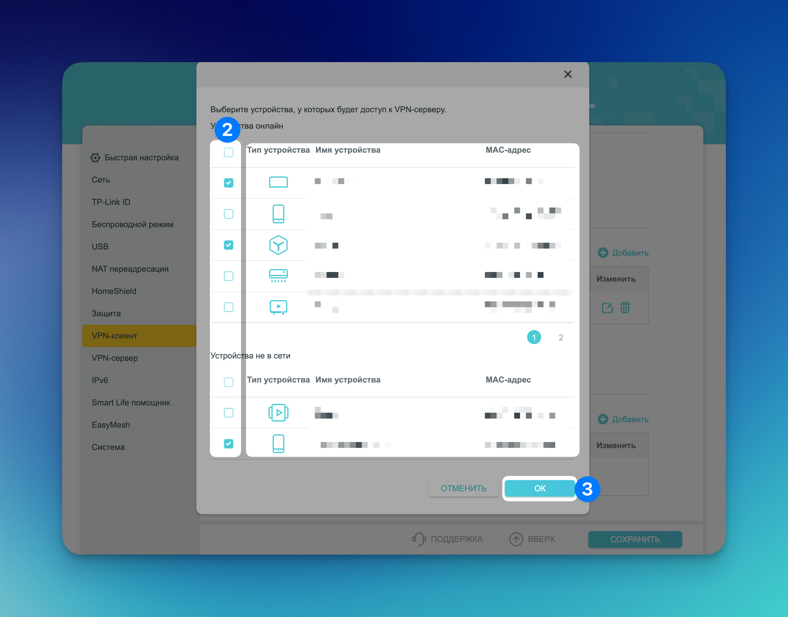 Отметьте галочками те устройства, которые будут использовать VPN для выхода в Интернет.