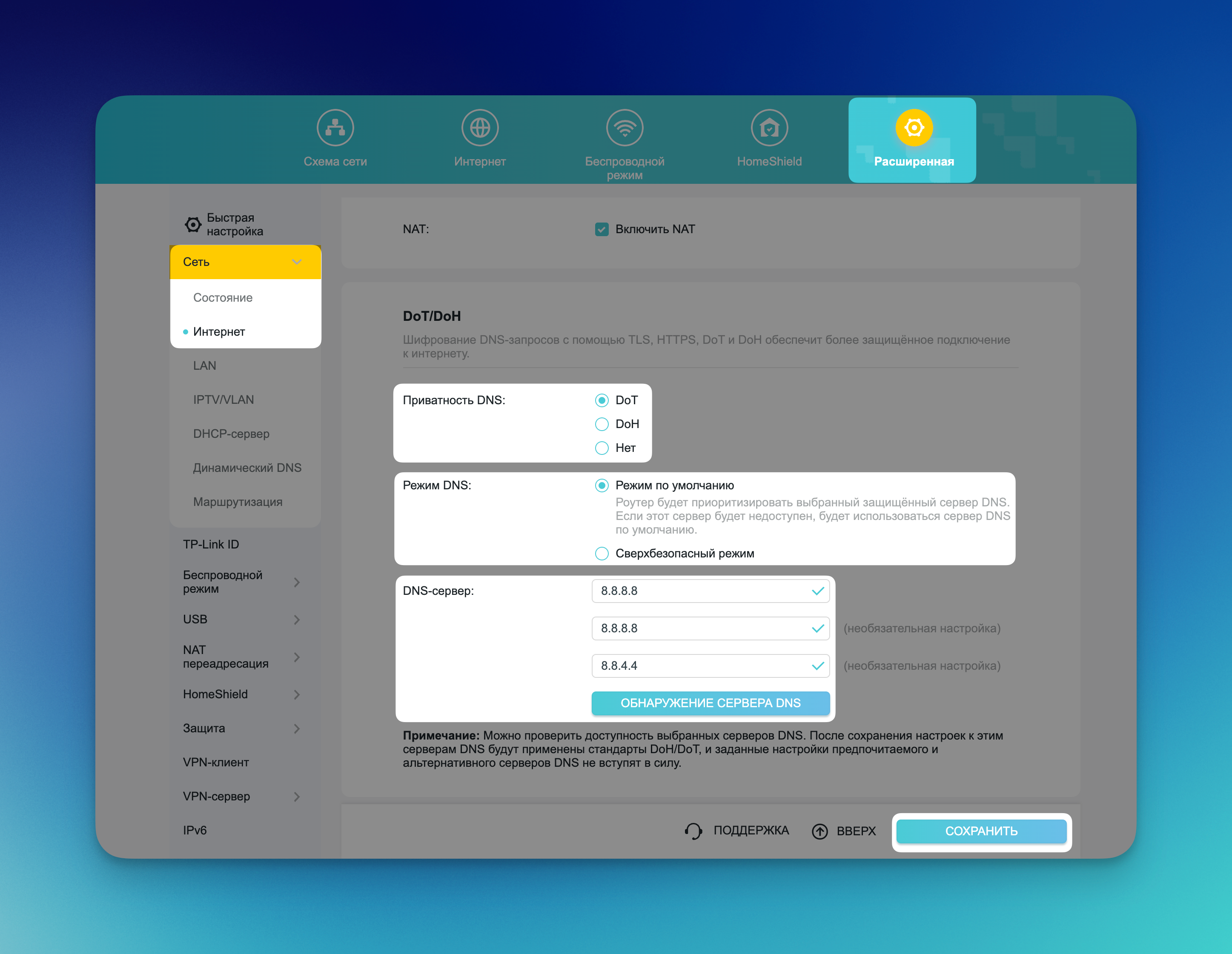 На странице веб-конфигуратора выберите Расширенная → Сеть → Интернет → DoT/DoH.