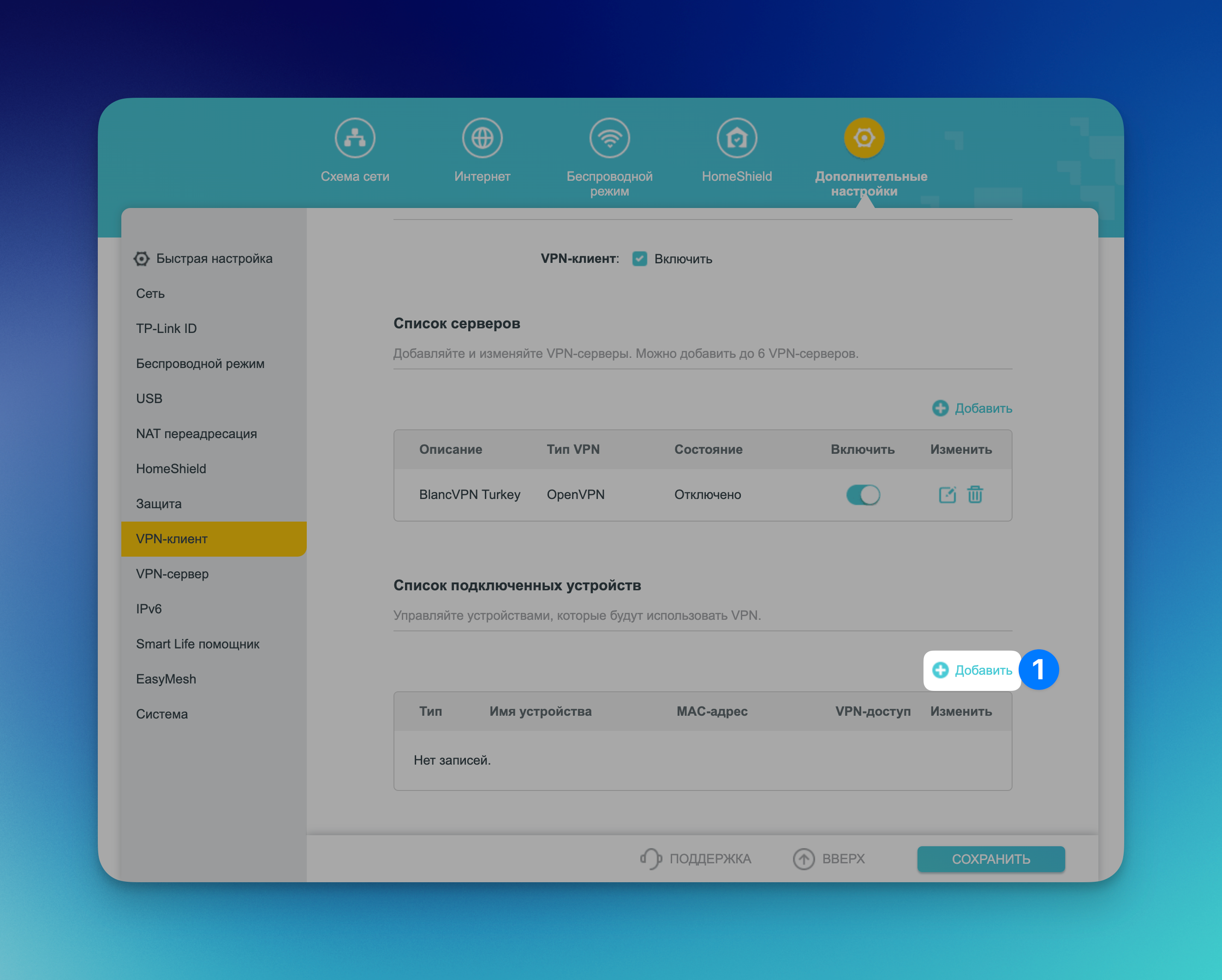 Выберите VPN-клиент. Если его нет, это значит, что ваш маршрутизатор не поддерживает подключение к VPN или прошивка устарела. См. список роутеров TP-Link, на которые можно установить VPN.